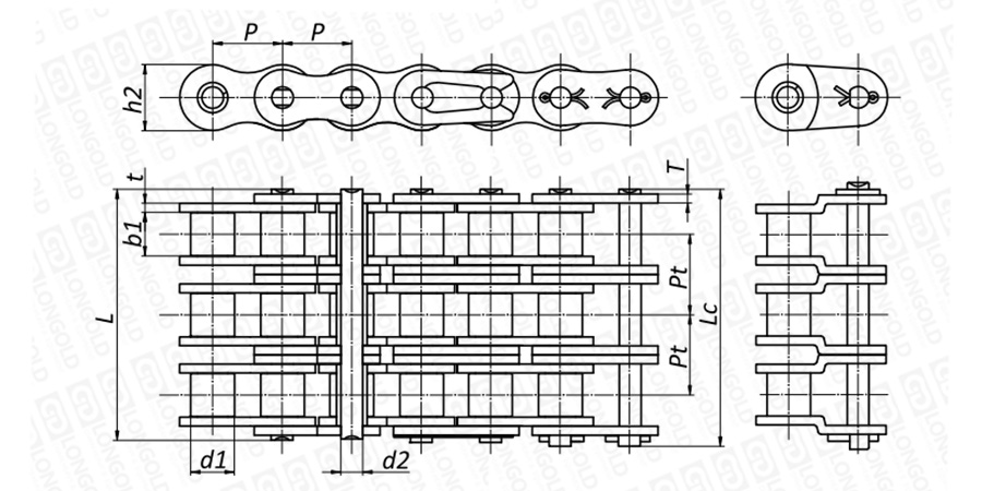 上圖為三排不銹鋼短節(jié)距A系列滾子鏈本體的結(jié)構(gòu)圖。