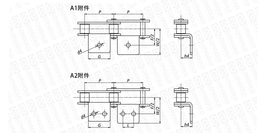 鏈條單側(cè)帶折彎板附件,附板上帶有1個(gè)或2個(gè)螺孔,附件表示為:A1、A2。