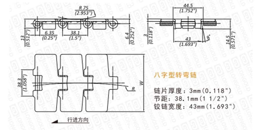上圖為LD881系列直行鏈的結(jié)構(gòu)圖,圖紙已標明本體尺寸。