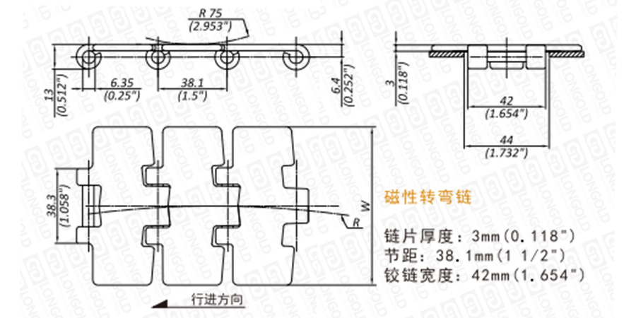 上圖為LD981M系列側彎鏈的結構圖,圖紙已標明本體尺寸。