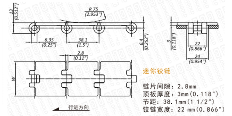 鏈片間距為1.8毫米,鏈板細長,當鏈片材質為碳鋼時,銷軸材質為表面硬化鋼;當鏈片材質為不銹鋼時,銷軸材質也選用不銹鋼。