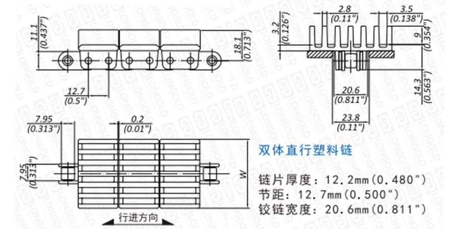 雙體鏈便于更換塑料節(jié),高機(jī)械強(qiáng)度,同單體鏈相比,即便是在負(fù)載條件下頻繁啟動(dòng)同樣可以長距離傳送并減小拉伸。RR845系列直行鏈,鏈條節(jié)距為12.7毫米。 鏈條為凸肋型,適合與過渡梳子板配套使用。