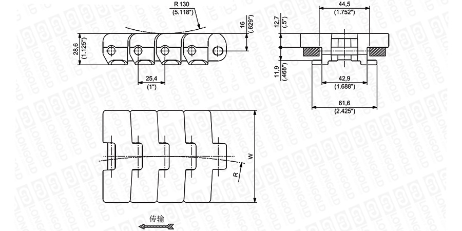 上圖為1"節(jié)距轉(zhuǎn)彎鏈板 793T系列的結(jié)構圖,圖紙已標明本體尺寸。