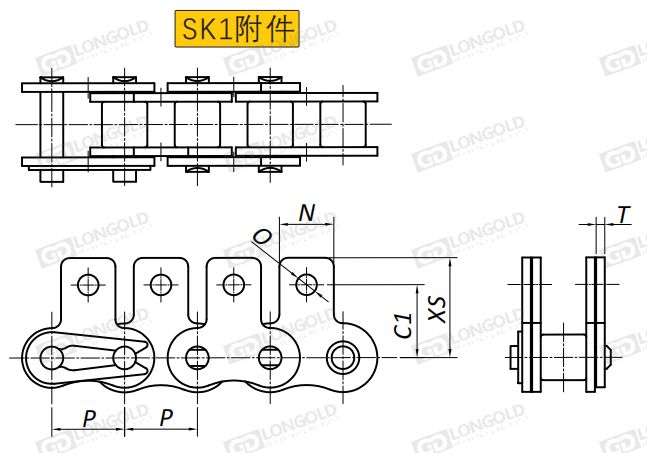 SK1附件,鏈條兩側鏈板延伸作為附板,且附板上帶單孔的附件形式。
