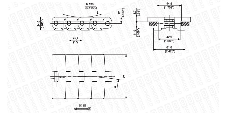 上圖為1"節(jié)距轉(zhuǎn)彎鏈板 783T系列的結(jié)構(gòu)圖,圖紙已標(biāo)明本體尺寸。