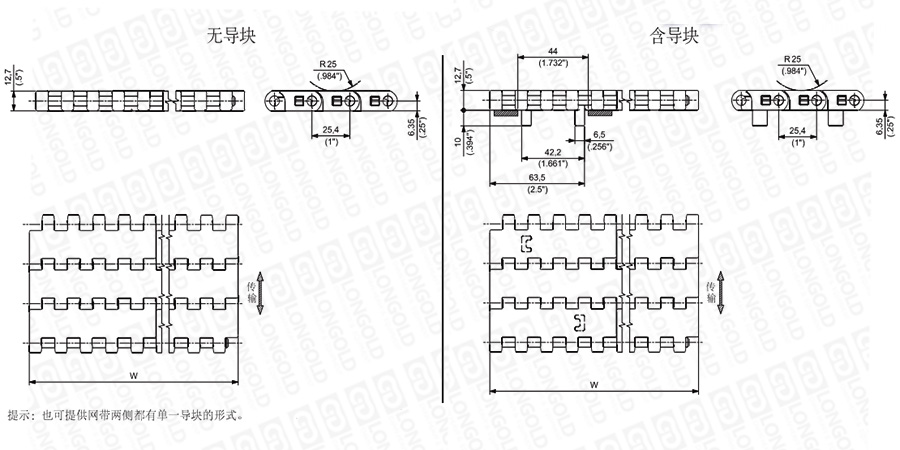 上圖為3/4"節(jié)距中載網(wǎng)帶與鏈板 7300系列,圖紙中已標明部分尺寸。