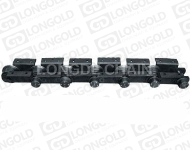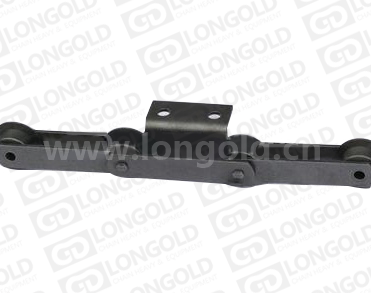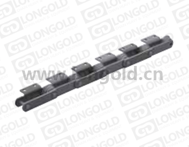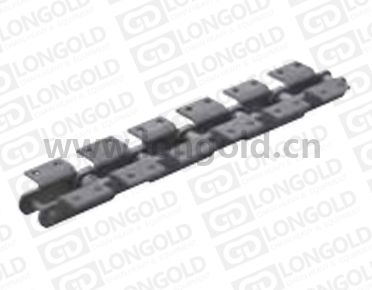 此種輸送鏈?zhǔn)怯呻p節(jié)距鏈條衍生而來(lái)的,鏈條節(jié)距為非常用規(guī)格,通過(guò)裝備附件使鏈條滿足特定的工作需求.