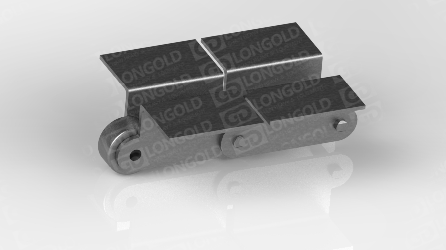 此種輸送鏈?zhǔn)怯呻p節(jié)距鏈條衍生而來的,鏈條節(jié)距為非常用規(guī)格,通過裝備標(biāo)準(zhǔn)附件或非標(biāo)附件使鏈條滿足特定的工作需求。