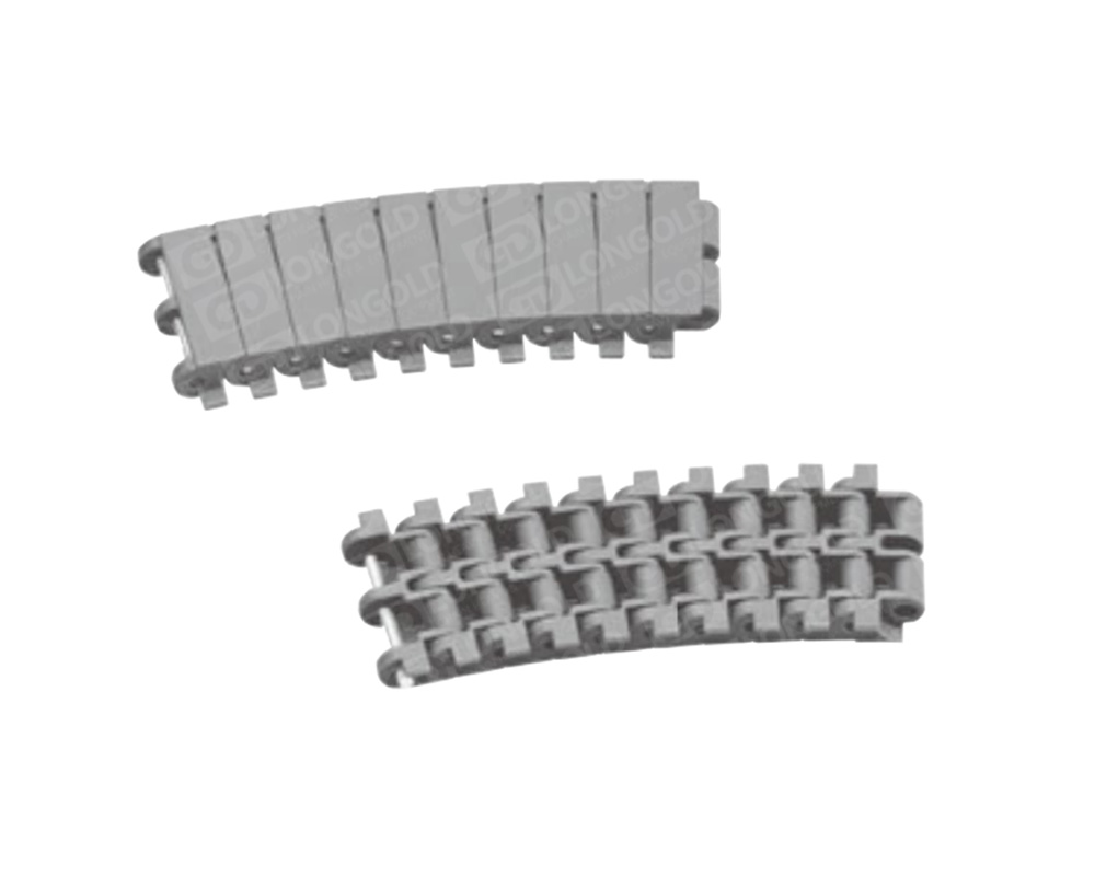 頂板鏈的鏈板通常比較寬大且厚實,其形狀多為平板狀。LSP60鏈條的側彎鏈形式,用于曲線輸送機。 銷軸有不銹鋼銷型和塑料銷型