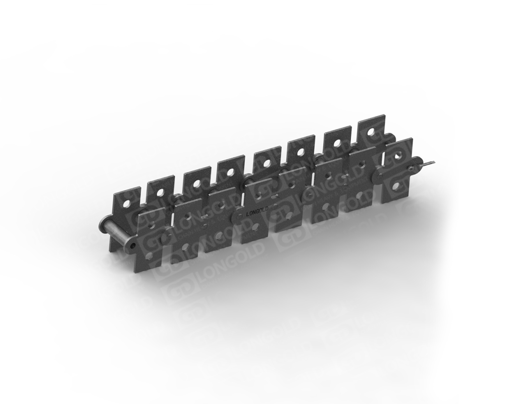 ANSI標準滾子鏈條的節(jié)距增加一倍,其他尺寸不變的鏈條。鏈條執(zhí)行ISO標準,鏈條單側(cè)鏈板向上下兩側(cè)延伸,且延伸的附板上帶有1個孔。