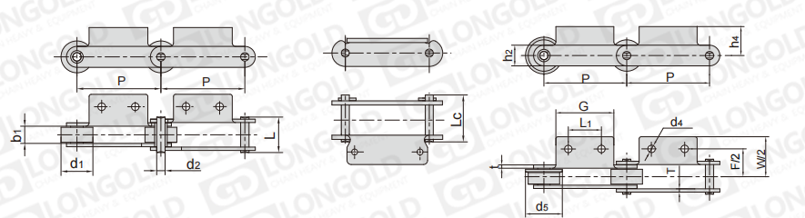 此種輸送鏈?zhǔn)怯呻p節(jié)距鏈條衍生而來(lái)的,鏈條節(jié)距為非常用規(guī)格,通過(guò)裝備標(biāo)準(zhǔn)附件或非標(biāo)附件使鏈條滿(mǎn)足特定的工作需求。