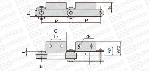 此種輸送鏈?zhǔn)怯呻p節(jié)距鏈條衍生而來(lái)的,鏈條節(jié)距為非常用規(guī)格,通過(guò)裝備標(biāo)準(zhǔn)附件或非標(biāo)附件使鏈條滿足特定的工作需求。