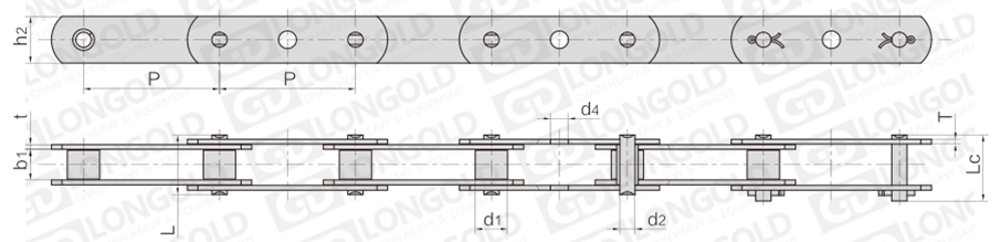 此種輸送鏈節(jié)距為非常用規(guī)格,通過裝備特殊附件使鏈條滿足特定的工作需求。