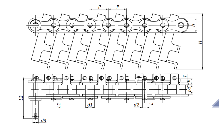 附件可配裝在每一個(gè)鏈節(jié)以上的鏈節(jié)間隔,如每偶數(shù)鏈節(jié)安裝,為了容易進(jìn)行保養(yǎng),安裝在外鏈節(jié)。