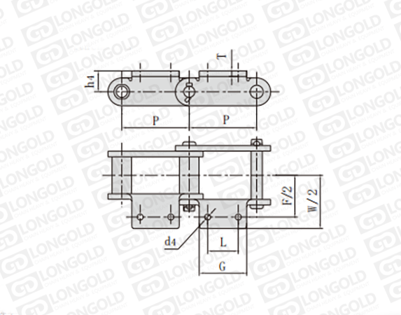 鏈條為套筒鏈,且?guī)2附件,即鏈條兩側(cè)鏈板帶折彎板,折彎板上帶兩個(gè)孔。