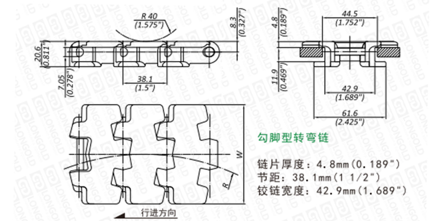 上圖為LD878T系列轉(zhuǎn)彎鏈的結(jié)構(gòu)圖,圖紙已標(biāo)明本體尺寸。