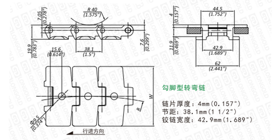 上圖為LD880TA系列轉(zhuǎn)彎鏈的結(jié)構(gòu)圖,圖紙已標(biāo)明本體尺寸。