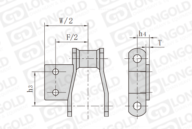 A2型附件:這些附件是帶有安裝孔的附板,平行于鏈節(jié)節(jié)距中心線安裝在鏈節(jié)的一側(cè)鏈板彎部上。
