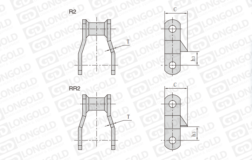 焊接結(jié)構(gòu)彎板鏈條是一種特殊結(jié)構(gòu)的鏈條,其鏈板采用彎板形式,并且通過焊接工藝將各個部件連接在一起。R2&RR2附件為特殊的附件形式,如有需要,請咨詢隆德技術(shù)人員。