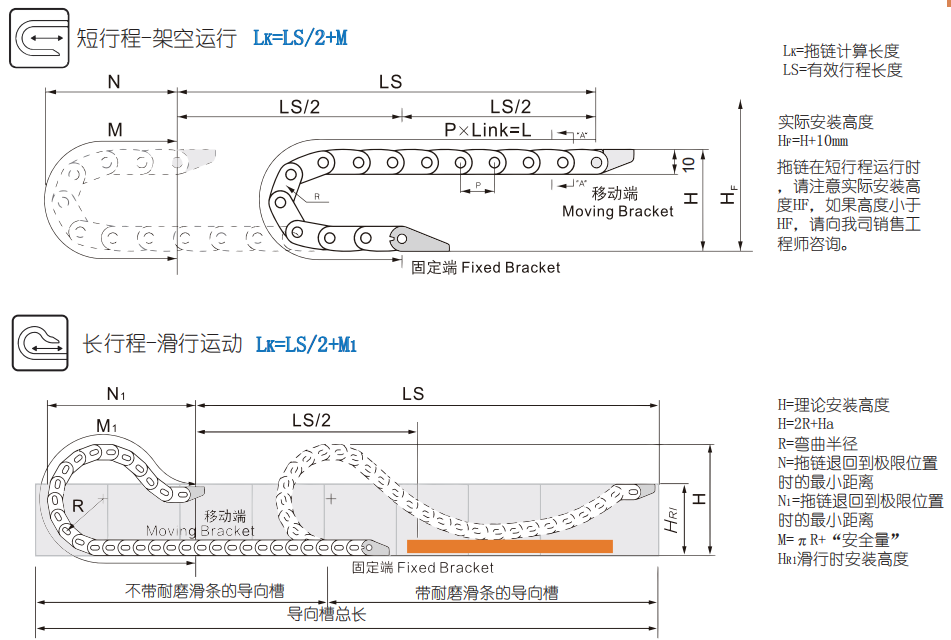 由眾多的單元鏈接組成,鏈接之間轉(zhuǎn)動(dòng)自如,可實(shí)現(xiàn)靈活的彎曲和伸展,短行程時(shí)為架空運(yùn)行,長行程時(shí)為滑動(dòng)運(yùn)行。