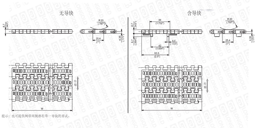1. 網(wǎng)帶寬度:85 mm (3.346")或以85 mm (3.346")遞增。