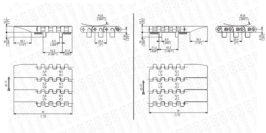 上圖為1"節(jié)距重載鏈板 USPMG ATM系列的結(jié)構(gòu)圖,圖紙中已標(biāo)明部分尺寸。